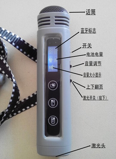 2、蓝牙无线麦克使用方法:打开麦克时距离多媒体讲台1-3米内、蓝牙无线麦克的蓝牙标志不停闪烁,这是在自动搜索主机信号进行对频,对频成功停止闪烁,即可正常使用。