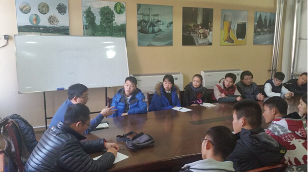 12月3日下午,工程训练中心一楼的啤酒品评室迎来了皇冠集团游戏平台15级生物工程设计兴趣小组的同学。首先由兴趣小组的指导老师聂聪博士和李丕武博士分别以啤酒发酵和柠檬酸发酵为例,介绍了厌氧发酵和好氧发酵工艺现状。聂老师的精彩讲述,不时博得同学们阵阵喝彩,大家对精酿啤酒的好奇心也被引到极点;随后,在老师的带领下,大家终于来到了中德啤酒中心的中试生产线旁边,开始接触实践之旅的第一站,同学们在聂老师的精彩讲解后,品尝了泡沫细腻的小麦啤酒,啤酒线上的师哥们也为师弟师妹们做生产情况的介绍,兴趣小组的同学们第一次喝到如此新鲜的啤酒,都感觉超棒,回味无穷;品完啤酒,大家又参观的啤酒知识介绍展板和新上的葡萄酒生产线。在依依不舍地完成了参观品评后,大家回到品评室余兴未尽,畅谈对兴趣小组未来工作的建议及对未来专业课的困惑。