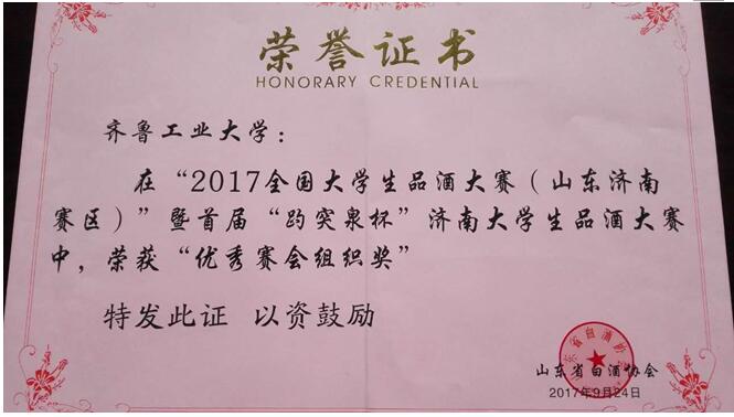 全国大学生品酒大赛初赛山东赛区暨首届“趵突泉杯”济南大学生品酒大赛于2017年9月24日在齐鲁工业大学隆重举行。济南初赛由山东白酒协会蒋彬秘书长亲自指导,济南趵突泉酿酒有限公司承办并冠名,国家级评委济南趵突泉公司副总经理吕志远担任济南赛区总评委,比赛分为味觉识别、香型识别、酒度差、质量差和重复再现性五个轮次。经过激烈角逐,最终皇冠集团游戏平台六名同学脱颖而出,分获济南赛区初赛一、二、三等奖。与其它地区的优胜者,组成30人的山东队,集训后代表山东省参加复赛。