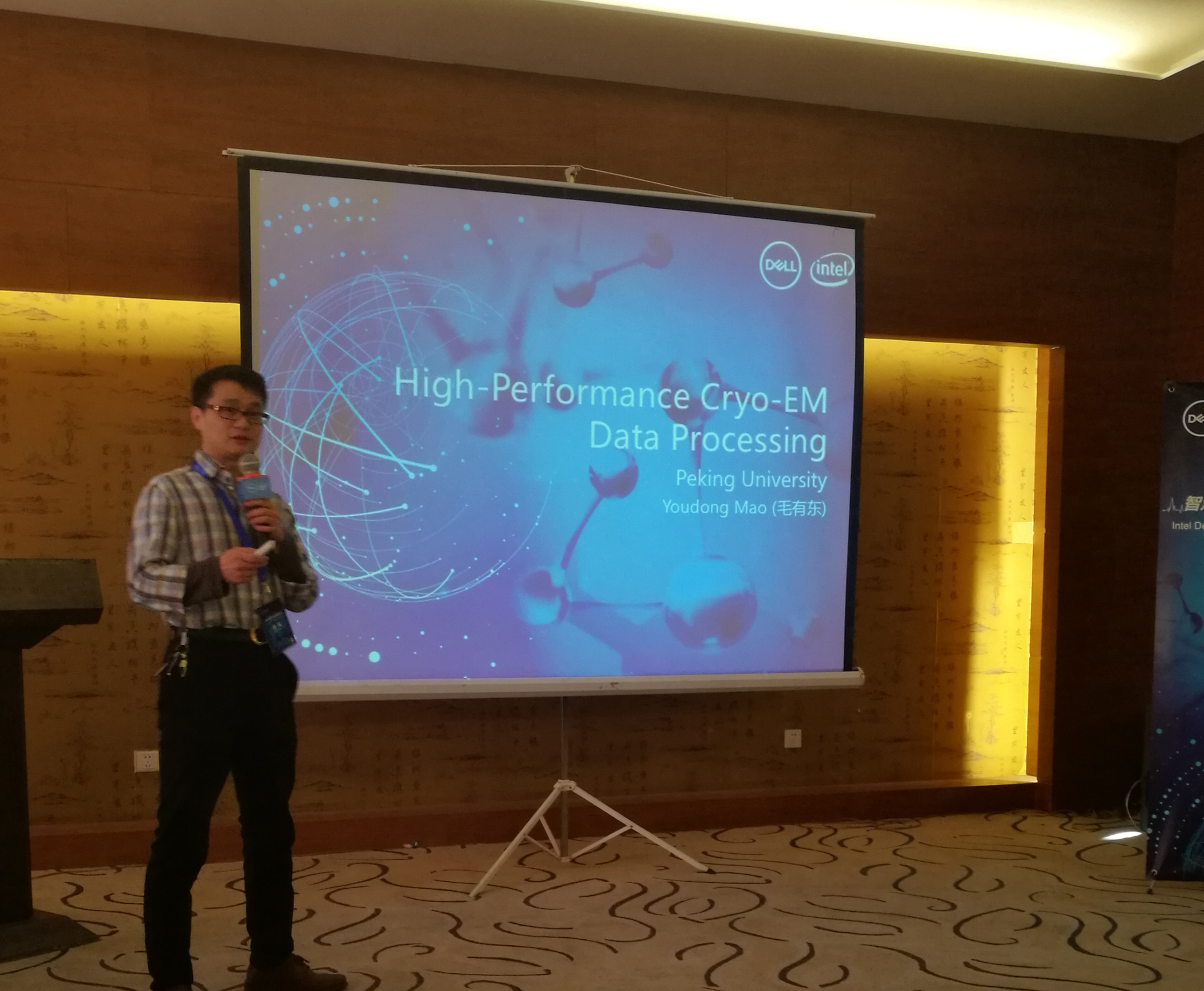 会上,来自清华大学国家蛋白质设施计算机中心的杨涛教授首先给大家做了题为“生物大分子三维重构计算在清华的实践”的报告,详细介绍了清华大学生物大分子三维重构高性能计算系统的具体架构和实践应用,向与会者阐述了“高性能计算和大数据分析支撑了当前生命科学研究热点”的理念。随后,包括北京大学毛有东教授、中科院韩飞教授在内的该领域的国际知名专家通过精彩的案例分析向大家展示了高性能计算技术和相关数理算法的发展在提高生物大分子三维重构的精度和尺度方面的应用,极大地提高了参会人员对生物大分子三维重构计算技术的认知程度。同时,高性能计算技术在生物大分子三维重构领域巨大的应用前景也吸引了相关公司的极大兴趣。作为该领域的技术领先者,同时也是清华大学生物大分子三维重构高性能计算系统的主要硬件和技术提供者,Dell和Intel公司也委派相关技术人员在会上介绍各自公司的高性能计算技术在生物大分子三维重构领域中的发展状况。会后,在清华大学-北京大学生命联合中心李雪明教授的带领下,与会人员参观了清华结构生物学中心,更为直观地了解了生物大分子三维重构技术相关的仪器设备和计算系统。