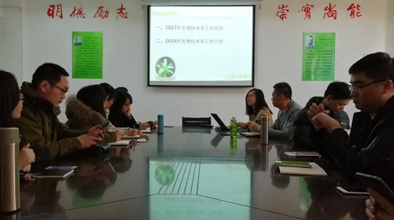 随后,郝鲁江主任对2018年度拟开展的工作进行了传达与规划。根据学校“八大行动计划”的内容,2018年度生物技术系拟在人才队伍建设、学科建设、人才培养、教学研究平台建设、课程建设、国际化办学、招生宣传、思政工作这八个方面展开工作。人才队伍方面,拟引进1-2名知名专家教授,3-5名优秀青年博士,进一步优化系内教师结构。学科建设方面,逐步扎实完成专业群建设任务,启动硕士点招生、培养工作。人才培养方面,拟针对生物技术系学生考研、就业特点,对本科培养方案进行调整。教学研究平台方面,拟利用系内资源,建立微生物资源、生物大数据、细胞代谢培养与遗传分子改造等平台。课程建设方面,继续深化VR的应用与开发,同时根据系内教师知识结构,组织教材出版。国际办学方面,收集总结学生、教师意见,逐步改善提升与马来西亚的合作办学项目,并于年内派出2名教师赴马来西亚交流学习。招生宣传方面,制作本科招生宣传ppt及宣传片,加强招生宣传。思政和党建工作方面,响应中央及学校的组织号召,积极开展思政工作及党内活动。