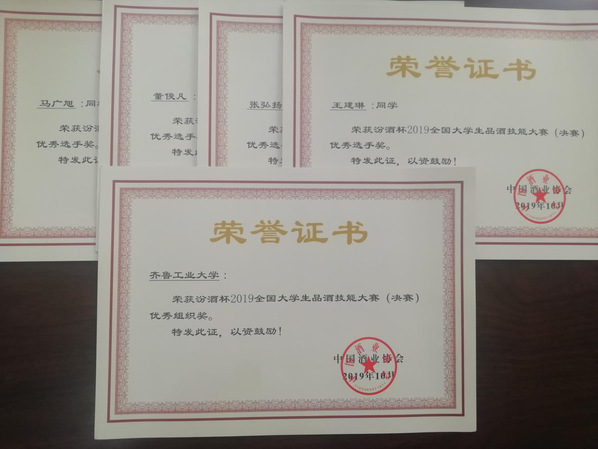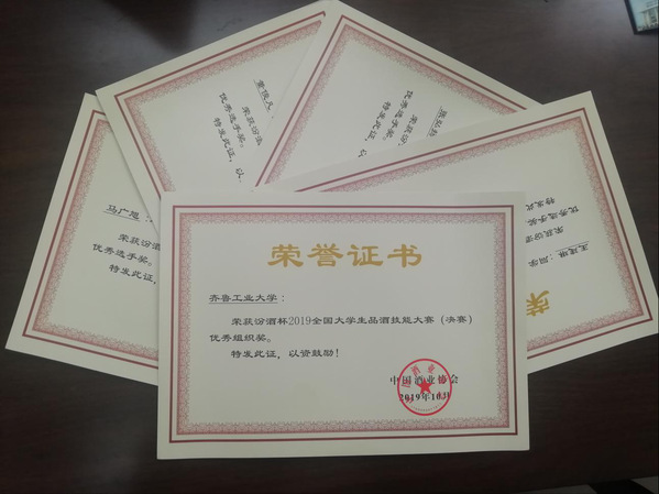 10月17日,由中国酒业协会主办,山西杏花汾酒厂股份有限公司协办的“汾酒杯2019全国大学生品酒技能大赛决赛”在上海举行。本次总决赛经过山东、安徽、四川、湖南、江苏、山西、北京、天津等14个赛区的初赛、复赛,最终有来齐鲁工业大学等40所大学共186名选手进入决赛。在本次大赛中,我校荣获优秀组织奖,我院酿酒工程专业2016级学生张弘扬、董俊凡、马广旭,2017级学生王健琳四位同学荣获优秀选手奖。