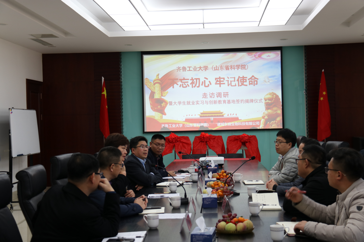 张召宁书记简要介绍了的历史沿革,他指出,自校院科教融合以来,学校平台资源、学科建设、科研水平、服务能力等有了大幅提升,教学、科研、实践三位一体的人才培养模式日益完善。他强调,本次揭牌仪式成功举行,标志着与诸城东晓生物科技有限公司对帮扶产学研合作的深入开展。希望学校和企业本着“优势互补、互惠互利、求真务实、共同发展”的原则,扎实落实合作协议,不断推动科学研究、人才培养、技术服务、产品研发、项目建设等取得新的成效,为东晓生物科技有限公司的发展提供强有力的科技支撑。