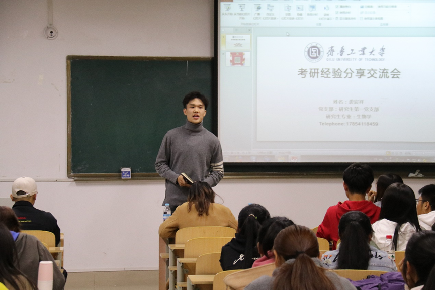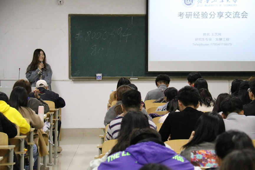 生物学专业的袭宸祥首先发言,他向大家介绍了自己学习、工作生活的经历,展示了一个热爱健身,学习成绩优异,爱旅行的男孩的阳光正能量。他告诉学弟学妹们,定一个小目标,一步一步来,劳逸结合,只有学习才是改变我们命运的捷径,并希望大家能够在正确的道路上坚守本心,一路向前。接下来,轻工技术与工程专业的张欣宜个大一同学传授了考研的宝贵经验。她说,同学们首先要想好是否考研,如果选择考研,就要保持良好的心态,制定详细的计划,不要害怕冷热嘲讽,不要恐惧流言蜚语,为了自己的前途,坚定自己,一切都是为了自己而学习。发酵工程专业的王艺纯从日常习惯中讲起,建议大家不要沉迷网络游戏,作息规律,并且要确定自己的目标,坚定不移的走下去。生物工程专业的胡顺娟建议大家从一个个小目标中实现自己的大目标,要认真学习专业课程,注重实践能力提升,要敢于通过参加竞赛,提升自己的能力,要认真对待每一次考试,不作弊,不马虎,为了更好的自己努力!