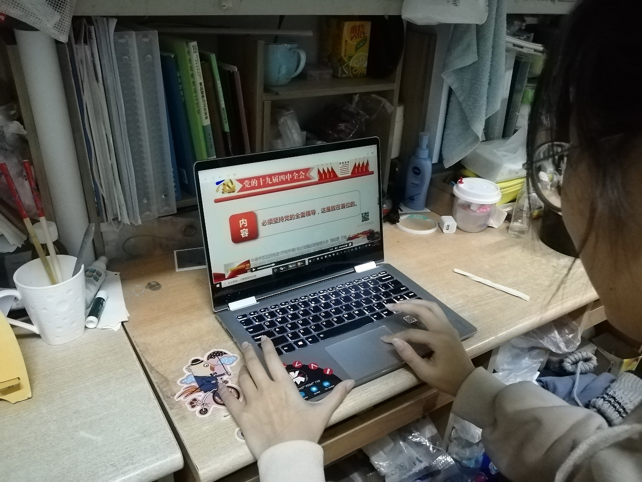 在宿舍中,预备党员们积极学习党的十九届四中全会精神,认真学习全会精神的相关视频和文件。预备党员们纷纷表示:“学习了党的十九届四中全会精神,我更加坚定了对党的绝对忠诚,对总书记绝对拥护的政治自信,更加坚定了走中国特色社会主义道路的道路自信。作为青年一代,我们要顺应时代的召唤,积极学习前辈艰苦奋斗的精神,用知识和能力武装自己,脚踏实地,努力奋斗,将个人的发展融入到社会主义现代化建设的伟大进程中,做新时代的建设者和接班人。”