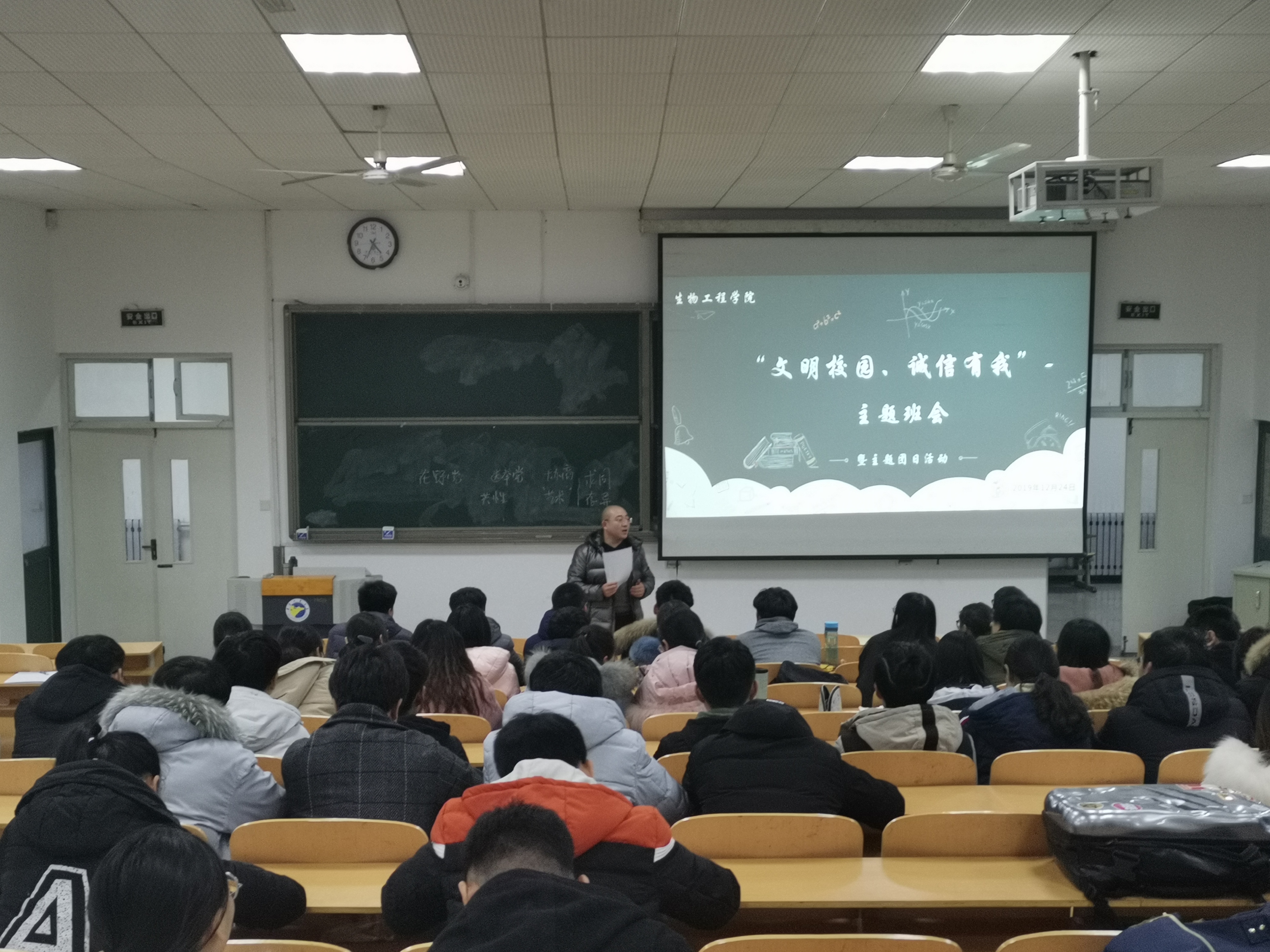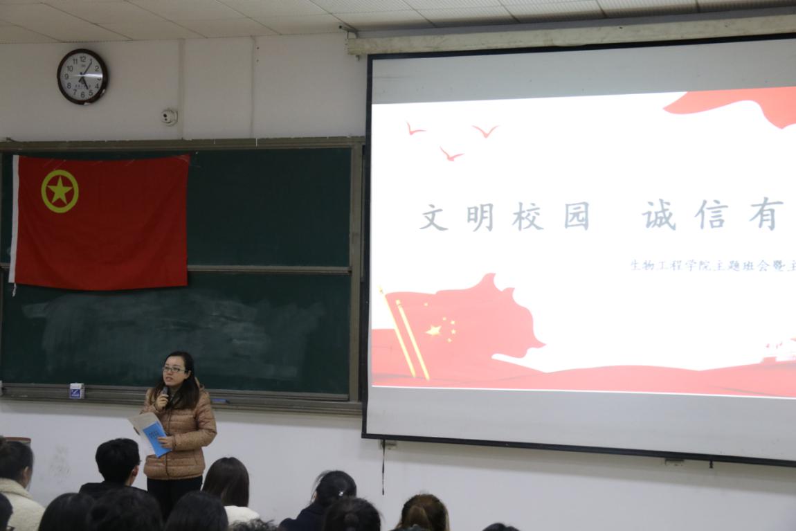 为加强校园文明建设,增强同学们的文明意识,近日,皇冠集团游戏平台在食工楼开展“文明校园,诚信有我”主题班会暨主题团日活动。本次活动分别由刘亚老师、赵跃老师和姚灵丽老师分年级进行,就近期校园文明建设及诚信考试等问题对生工学院全体同学提出要求。