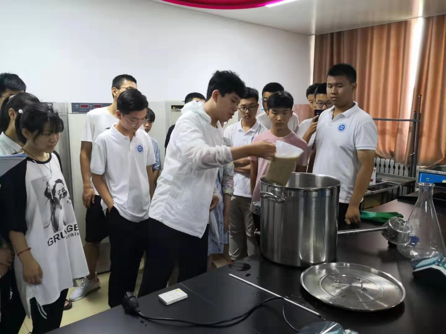 我院积极配合学校工作,专业老师教授酿酒专业知识,引导学生们动手试验,开展了大量有趣的工作,充分反映了我齐鲁人“敢为人先,担当作为,实事求是”的工作作风和精神品质。通过老师对酿酒过程的讲解,学生们跃跃欲试,对酿酒产生了浓厚兴趣。从对酒花、下料糖化、过滤、麦汁蒸煮、发酵等内容的了解,到每人领取到签好自己名字的“专属啤酒”,等待瓶内发酵成功的雀跃,师生间着实体会到了教学相长、寓教于乐的意义。