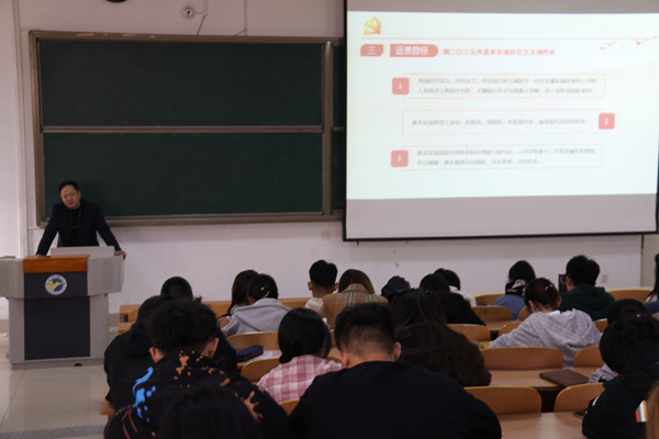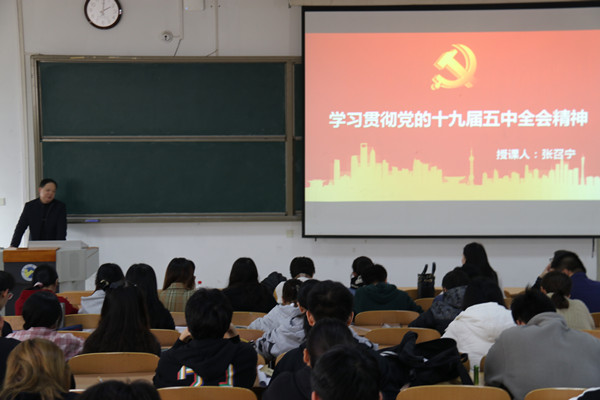 11月13日下午,皇冠集团游戏平台党委书记张召宁为全体学生党员和入党积极分子上了一堂题为《学习贯彻党的十九届五中全会精神》的主题党课。
