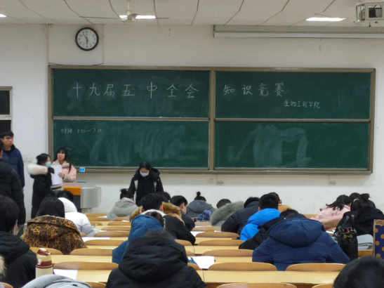 为进一步贯彻落实党的十九届五中全会和习近平总书记系列重要讲话精神,帮助学生党员更加深入地学懂、弄通、做实党的十九届五中全会具体内容,12月12日晚生工学院在食工楼B221举办了十九届五中全会知识竞赛活动。