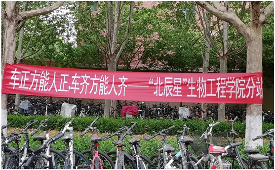 学生党员们每天准时来到活动地点集合,分为五个小组,生工分站副站长姜肇旭给各小组分配任务。活动期间,党员们佩戴党员徽章,张贴宣传横幅,将所有的僵尸车整齐排放在一起,并将无序停放的自行车、电动车进行集中停放,同时引导同学们整齐停放车辆。整个活动过程中,大家相互配合,共同将原本凌乱的车子摆放的整齐有序。