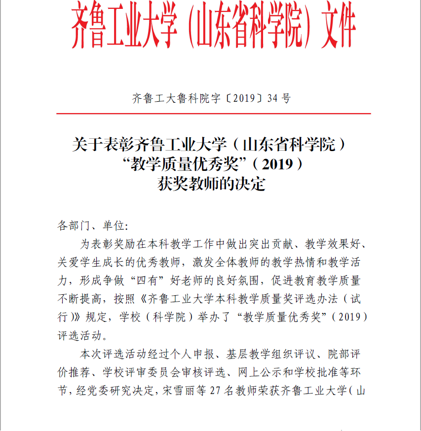 齐鲁工业大学(山东省科学院)教学质量优秀奖