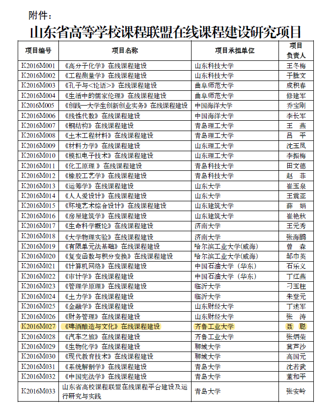 山东省网络在线课程“啤酒酿造与文化”建设项目