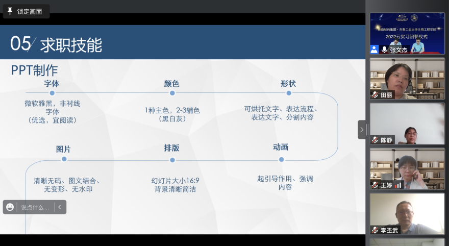 2022年5月23日至2022年5月31日,齐鲁工业大学生物工程学部19级生物工程专业本科学生以及学部领导李丕武、王婷、生物工程系主任刘同军及亓正良、张大伟、陈静、田丽、郑凯、岳秋林、蒋艺等老师一同参加了此次鲁南制药集团为期七天的线上云实习活动。