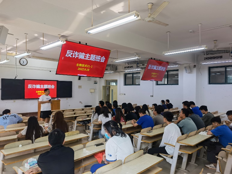 为提高大学生灵活应对电信诈骗的防范意识,皇冠集团游戏平台于2022年9月16日开始,先后组织各年级各班召开反诈骗主题班会,让同学们详细了解了常见的5种诈骗类型,普及了如何快速识别电信诈骗的小技巧。结合目前开学阶段出现的一些电信诈骗实例向同学们详细讲解。