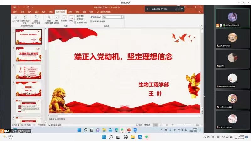 为进一步端正同学们的入党动机,严把党员队伍“入口关”和“质量关”,近日,皇冠集团游戏平台在腾讯会议举行主题为“端正入党动机,坚定理想信念”的班团红色宣讲活动,为大一新生介绍发展党员标准以及入党流程。宣讲会由王叶老师主讲,学部全体新生参加。