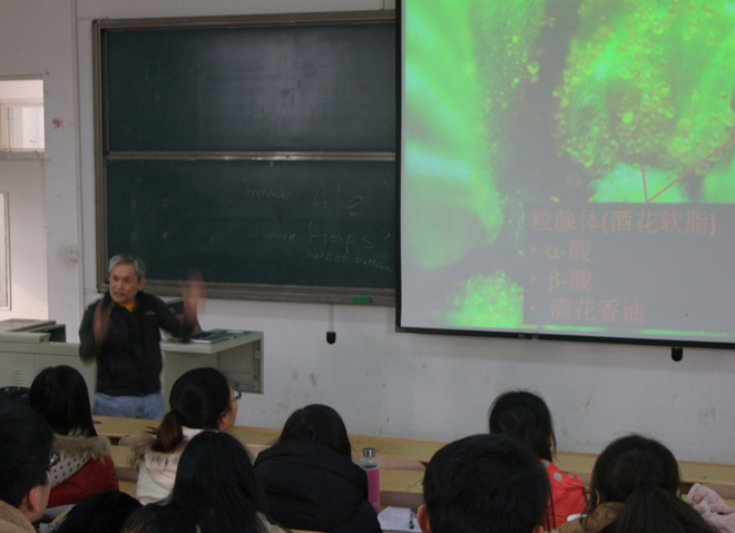 讲课主题为啤酒花和酒花制品對啤酒釀造的功能:内容涉及酒花歷史和背景,啤酒花的种植和加工,苦味的品質及抑菌性酒花风味化学等。Patrick L. TING博士讲课风趣幽默,深入浅出,从酒花中香气分子结构到组成为学生进行了全面的诠释,深受同学们的好评。