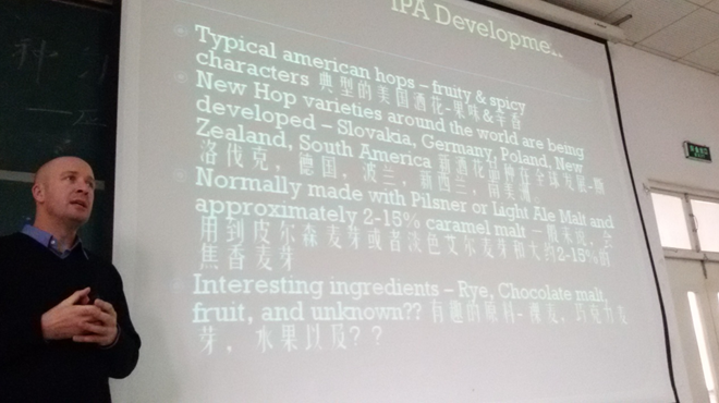 Mr. Leon Mickelson具有多年的酿酒经验,设计和酿制的精酿啤酒种类多达上百种,历任世界啤酒大赛评委,其酿造的啤酒在世界大赛中多次获奖。他为学生讲解了“世界啤酒比赛概况”,“国际精酿啤酒设备最新进展”和“IPA和Cider啤酒的生产工艺”等专题课程,学生们开阔了视野,增长了见识,进一步加深了对啤酒行业最新进展的了解。
